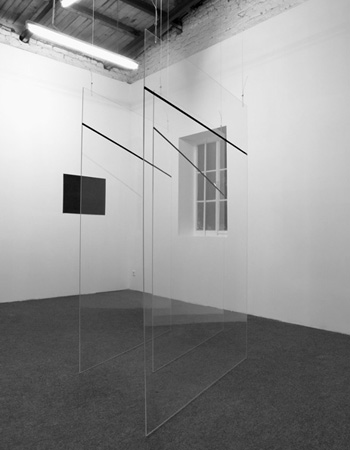 9 Christina Kramer Über das Verlassen der Tatsachen, 2009 Acrylglasplatten, Klebeband, Drahtseile, Siebdruck auf Papier